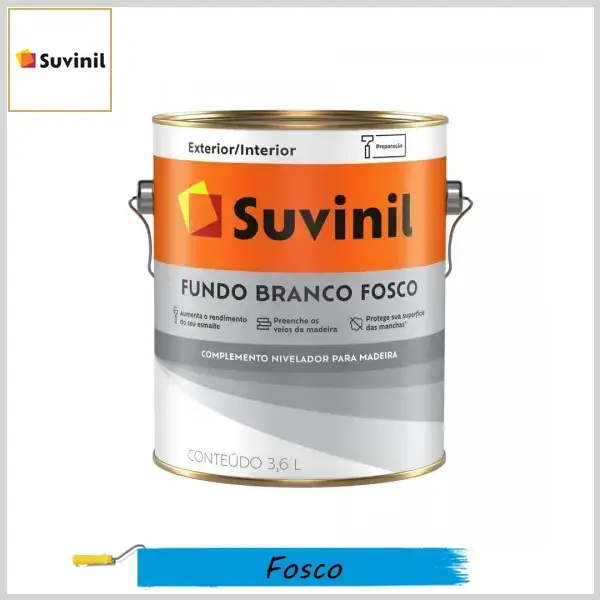 Suvinil Fundo Branco Fosco é um complemento nivelador para madeira que preenche os veios, protege a superfície e ainda faz o esmalte, que será aplicado depois, render muito mais.