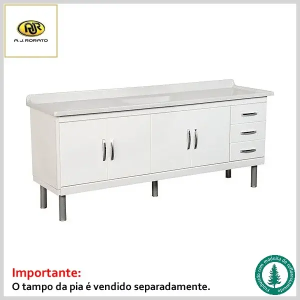 Produto com gabinete no estilo "sanduíche" com estrutura feita com madeira de reflorestamento próprio, tratada em estufas com altas temperaturas. Portas e gavetas são confeccionadas em MDF madeirado com lâmina melamínica com maior resistência à luz, umidade e de fácil limpeza. O produto é fornecido com puxadores com alça e pés em ABS com fixação por rosca.