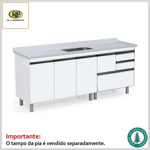Produto com gabinete no estilo "sanduíche" com estrutura feita com madeira de reflorestamento próprio, tratada em estufas com altas temperaturas. Portas e gavetas são confeccionadas em MDP-BP 15mm madeirado com lâmina melamínica com maior resistência à luz, umidade e de fácil limpeza. O produto é fornecido com corrediças telescópicas, portas com dobradiças hidráulicas com click, gaveta superior com porta-talheres, puxadores com perfil de alumínio e pés em ABS com fixação por rosca.
