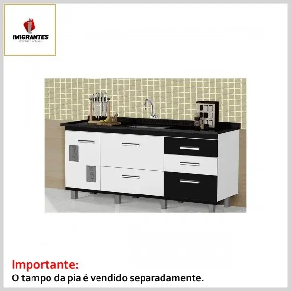 Gabinete de Cozinha MDP s/Tampo Mondrian Preto - Largura 1.5m (L146 x P51 x A83cm) - Imigrantes