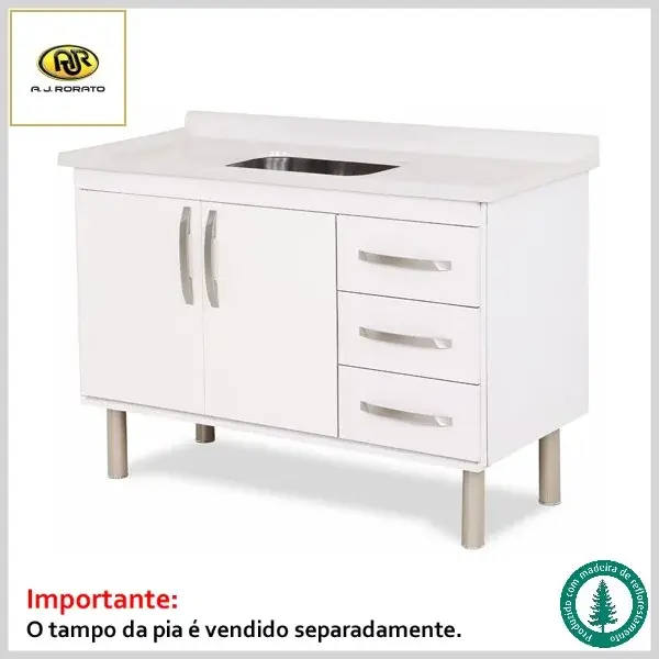 Gabinete de Cozinha Munique 116.2cm Mdp 5401 2Portas+3Gavetas s/Tampo - Branco - AJ Rorato