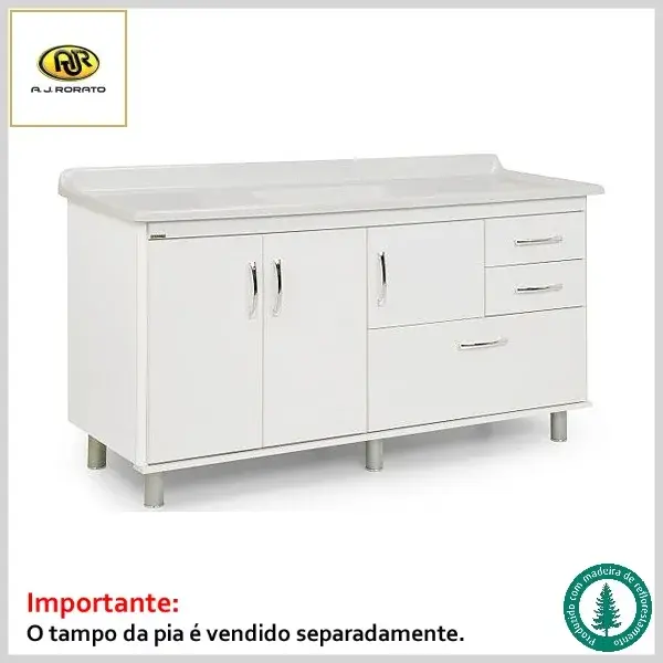 Gabinete de Cozinha Supremo 158.7cm Mdf 5854 3Portas+3Gavetas s/Tampo - Branco - AJ Rorato