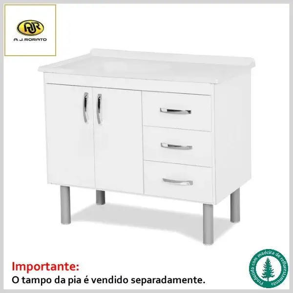 Gabinete de Cozinha Tóquio 95.2cm Mdp 5391 2Portas+3Gavetas s/Tampo - Branco - AJ Rorato