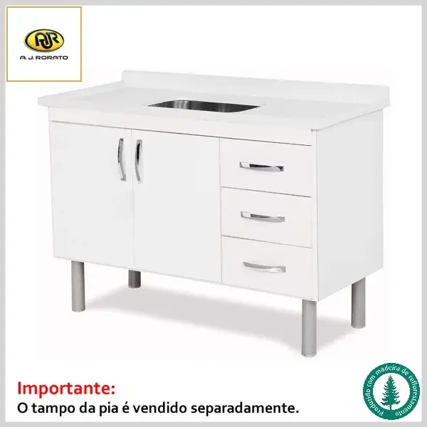 Gabinete de Cozinha Tóquio 116.2cm Mdp 5392 2Portas+3Gavetas s/Tampo - Branco - AJ Rorato
