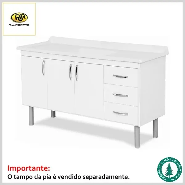 Gabinete de Cozinha Tóquio 144.2cm Mdp 5394 3Portas+3Gavetas s/Tampo - Branco - AJ Rorato