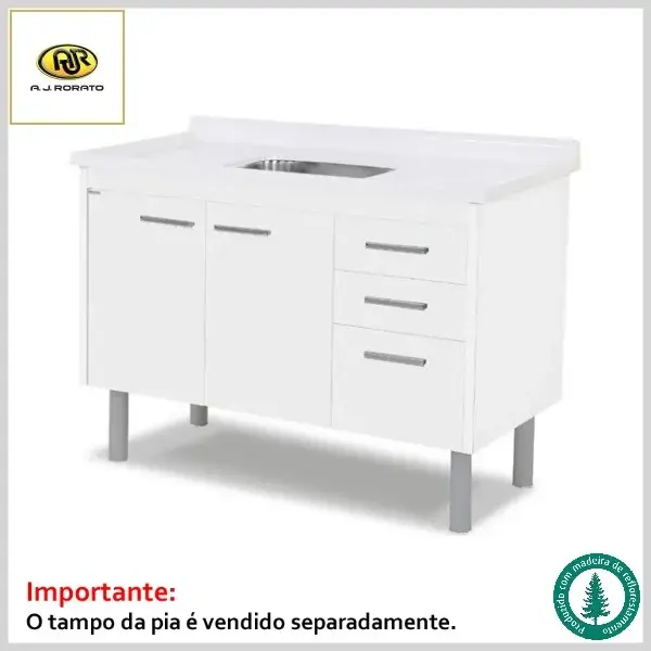 Gabinete de Cozinha Valenza 116.2cm Mdp 5601 2Portas+3Gavetas s/Tampo - Branco - AJ Rorato
