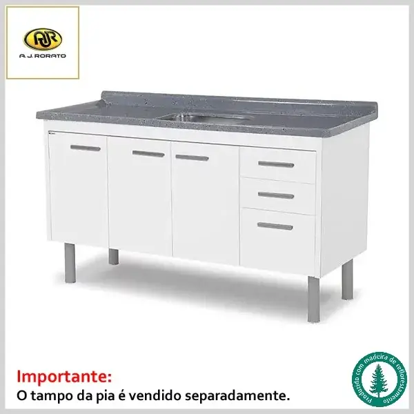 Gabinete de Cozinha Valenza 144.2cm Mdp 5603 3Portas+3Gavetas s/Tampo - Branco - AJ Rorato