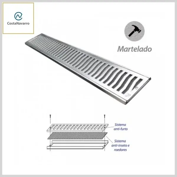 COSTA NAVARRO GRELHA RETA FIXA PARAFUSADA COM TELA é um produto inovador que dificulta empenamento e furto, além de exclusivo sistema que impede o acesso de insetos e roedores, sendo muito fácil de instalar.