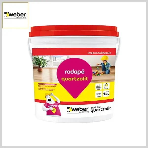 Rodapé Quartzolit é um impermeabilizante e endurecedor à base de água que forma uma barreira impermeável e invisível em paredes e rodapés. É indicado para o tratamento de eflorescências e na prevenção de mofo e umidade em paredes e superfícies de reboco ou emboço. Também pode ser utilizado na impermeabilização e endurecimento de superfícies com rebocos ou substratos fracos e degradados.