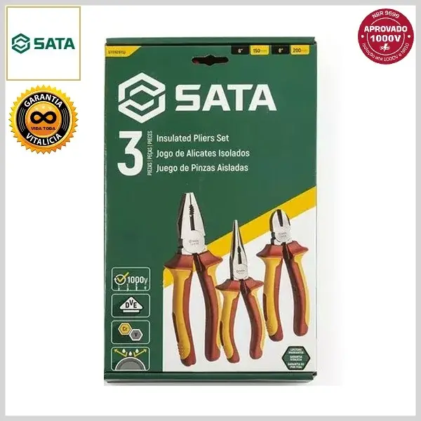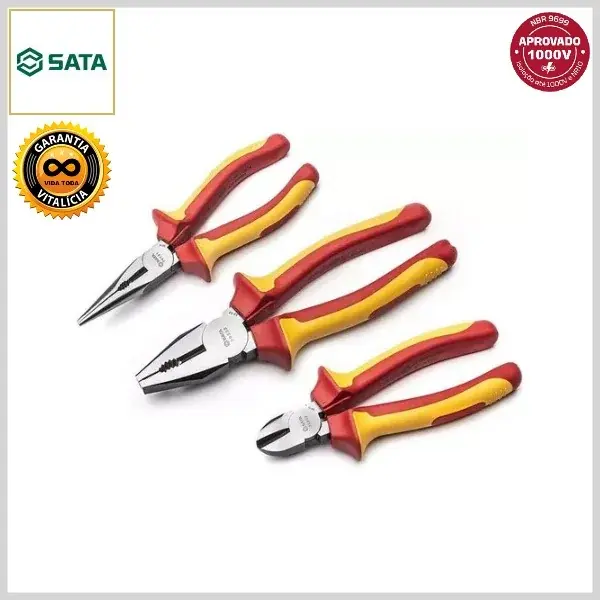 Jogo de Alicates (3pçs: Bico/Corte/Universal) Cromo Vanádio VDE-IEC Isolado c/Cabo Tri-Componente - Caixa c/3 peças - Sata