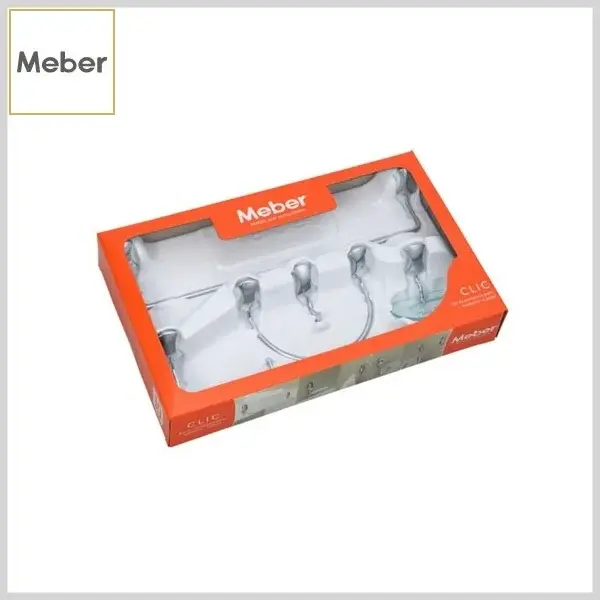 A linha de acessórios Clic da MEBER é uma solução inteligente para completar de forma prática a composição de banheiros e lavabos. O kit de acessórios tem excelente aproveitamento na relação custo-benefício, com peças que privilegiam formas simples e clássicas, combinando harmonicamente com os mais variados perfis de projetos. Os kits de acessórios para banheiro são compostos por 5pçs (toalheiro reto de 507mm, porta-papel, saboneteira, cabide e toalheiro argola). Produzidos em liga de cobre e plástico de engenharia, possuem 10 anos de garantia contra defeitos de fabricação e acabamento.