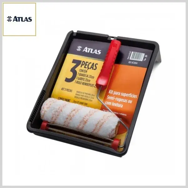 KIT DE PINTURA ATLAS AT2004, contém 3 peças no conjunto, composto por 1 bandeja 1523P preta, 1 garfo 330/23SR e 1 rolo rende plus 327/19 com lã altura 19mm. Os componentes do kit são indicados para pintura em superfícies semi-rugosas ou com textura, com o uso de tintas acrílicas, látex pva ou esmaltes.
