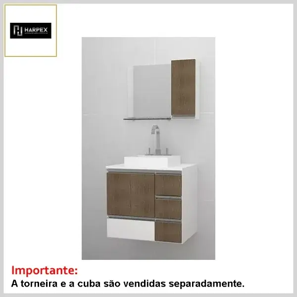 O produto é indicado para mobiliário de banheiros e lavabos. Produzido em Mdp dupla face de baixa pressão, possui dobradiças metálicas, puxadores em Abs, espelho e armário lateral que acompanham o conjunto.
