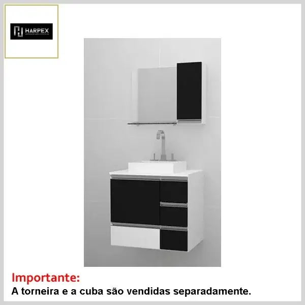 O produto é indicado para mobiliário de banheiros e lavabos. Produzido em Mdp dupla face de baixa pressão, possui dobradiças metálicas, puxadores em Abs, espelho e armário lateral que acompanham o conjunto.