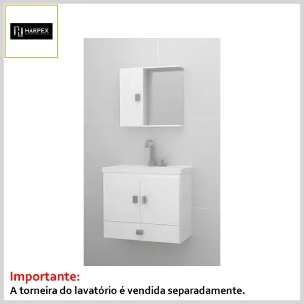 O produto é indicado para mobiliário de banheiros e lavabos. Produzido em Mdp dupla face de baixa pressão, possui dobradiças metálicas, puxadores em Abs, espelho e armário lateral que acompanham o conjunto.