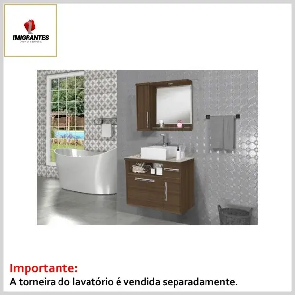 O produto é indicado para mobiliário de banheiros e lavabos. Produzido em Mdp, possui revestimento madeirado de alta resistência, dobradiças metálicas, corrediças telescópicas de 350mm, puxadores em Abs cromado, espelho lapidado 3mm, tampo de vidro 4mm e cuba Roma na cor branca.