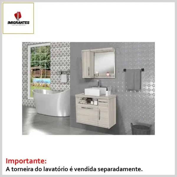 O produto é indicado para mobiliário de banheiros e lavabos. Produzido em Mdp, possui revestimento madeirado de alta resistência, dobradiças metálicas, corrediças telescópicas de 350mm, puxadores em Abs cromado, espelho lapidado 3mm, tampo de vidro 4mm e cuba Roma na cor branca.