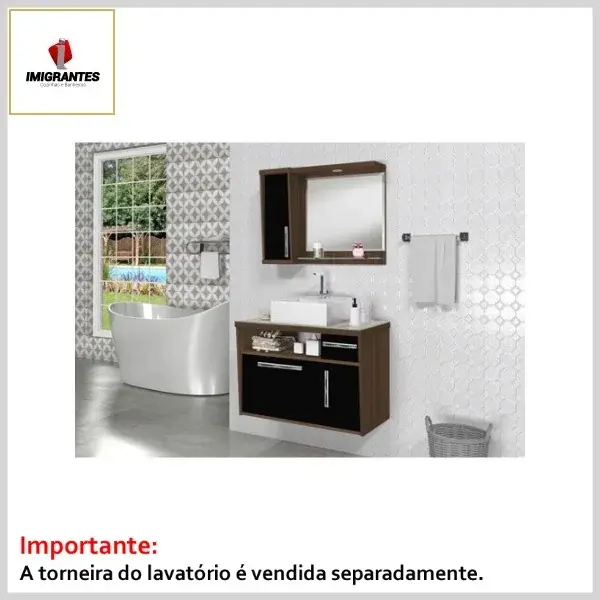 O produto é indicado para mobiliário de banheiros e lavabos. Produzido em Mdp, possui revestimento madeirado de alta resistência, dobradiças metálicas, corrediças telescópicas de 350mm, puxadores em Abs cromado, espelho lapidado 3mm, tampo de vidro 4mm e cuba Roma na cor branca.