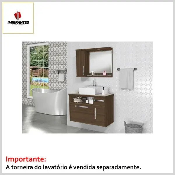 O produto é indicado para mobiliário de banheiros e lavabos. Produzido em Mdp, possui revestimento madeirado de alta resistência, dobradiças metálicas, corrediças telescópicas de 350mm, puxadores em Abs cromado, espelho lapidado 3mm, tampo de vidro 4mm e cuba Roma na cor branca.