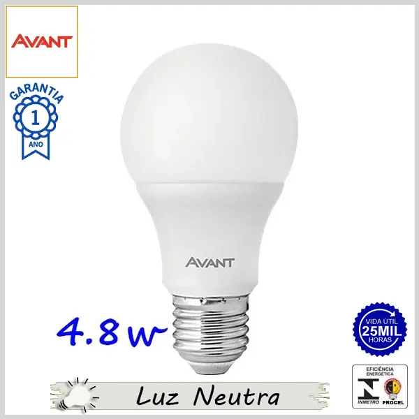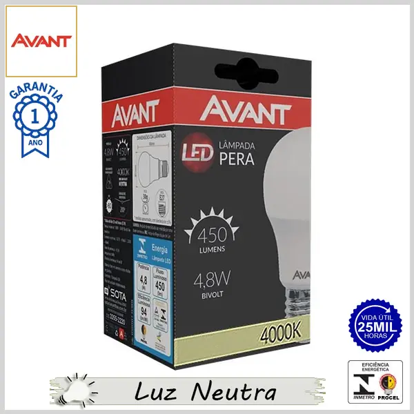 Lâmpada Led E27 BulboA PeraLed 4.8Wx4000K (Luz Neutra) - Bivolt (A55) - 450 lumens - Avant