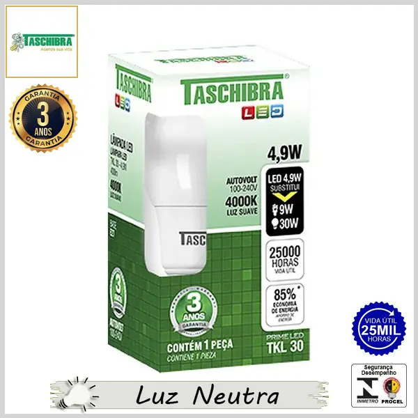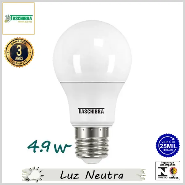 Lâmpada Led E27 BulboA PrimeLed 4.9Wx4000K (Luz Neutra) - Bivolt (A55) - 400 lumens - Taschibra