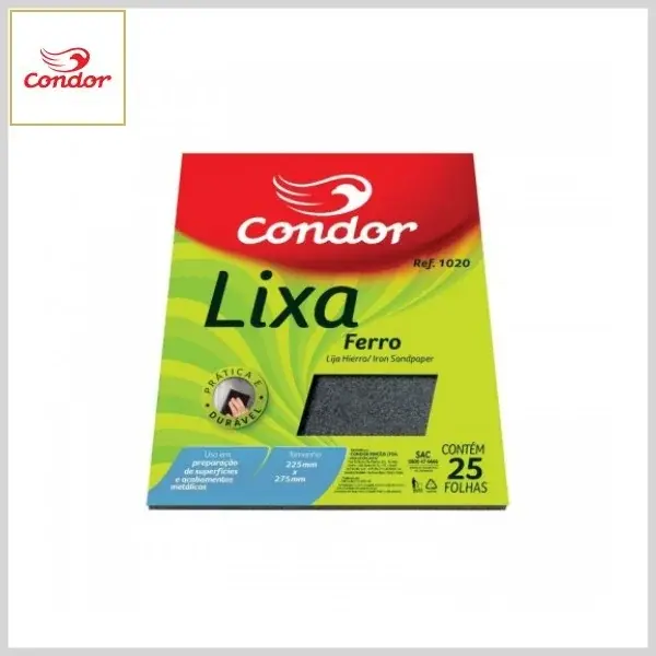 LIXA PARA FERRO CONDOR 1020 é produzida nas granulometrias 36, 60, 80, 100 e 120 grãos. De alta durabilidade e com folhas no tamanho 225x275mm é indicada para a remoção de áreas oxidadas e preparação para pintura em superfícies metálicas.