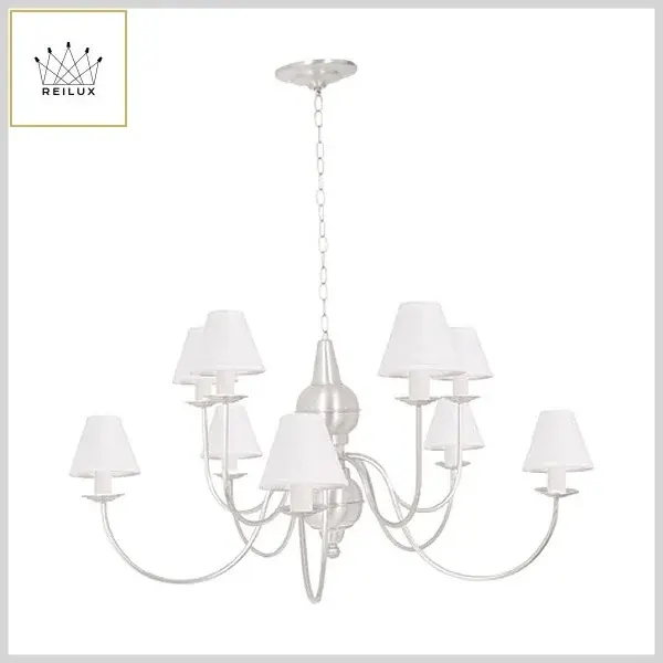 Lustre de Alumínio 141 10Braços 10xE27 Cúpula Tecido Branco - Branco Brilhante - Reilux
