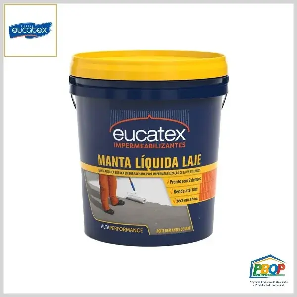 Eucatex Manta Líquida Laje é um produto acrílico elastomérico, de cor branca, para aplicação a frio, que forma uma membrana elástica e impermeável , resistente à ação de intempéries e que contribui para a redução de temperatura em lajes e telhados, atuando como isolante térmico. É indicado para impermeabilização de lajes, telhas de amianto ou galvanizadas, caixas de água cimentícias, rufos e calhas. Obtenha mais informações sobre o produto consultando o Boletim Técnico anexado à esta página.