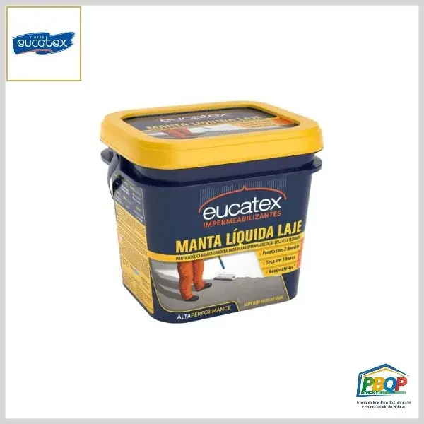 Eucatex Manta Líquida Laje é um produto acrílico elastomérico, de cor branca, para aplicação a frio, que forma uma membrana elástica e impermeável , resistente à ação de intempéries e que contribui para a redução de temperatura em lajes e telhados, atuando como isolante térmico. É indicado para impermeabilização de lajes, telhas de amianto ou galvanizadas, caixas de água cimentícias, rufos e calhas. Obtenha mais informações sobre o produto consultando o Boletim Técnico anexado à esta página.