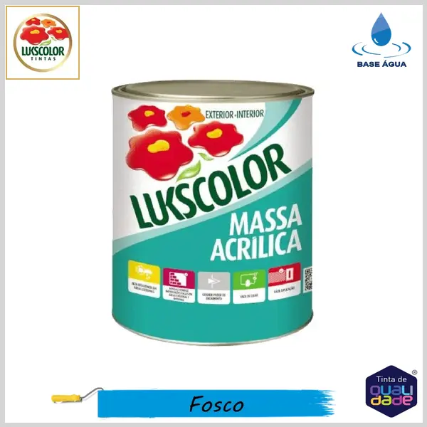Lukscolor Massa Acrílica é um produto à base de água, de cor branca e aparência fosca, com excelente qualidade, rendimento superior e elevada consistência e poder de enchimento, sendo indicado para nivelar e corrigir imperfeições rasas em áreas internas e externas secas, sobre reboco, concreto, gesso e fibrocimento. É um produto fácil de aplicar e lixar, proporcionando uma pintura com acabamento perfeito. Não deve ser aplicada em superfícies mofadas ou com presença de umidade.