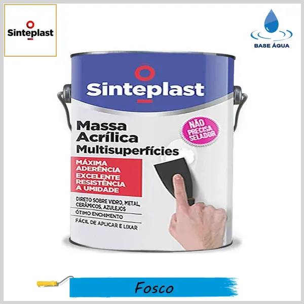 Sinteplast Massa Acrílica é produto de cor branca a base de água, de fácil aplicação e que possui excelente poder de cobertura, enchimento e rendimento, sendo super resistente às intempéries. É indicada para nivelar e corrigir pequenas imperfeições em superfícies internas e externas de reboco, gesso, alvenaria, concreto, fibrocimento, vidro, metal, cerâmica, azulejos e áreas já pintadas anteriormente, proporcionando um acabamento fosco, liso e fino. Não utilizar o produto em superfícies mofadas ou com presença de umidade.