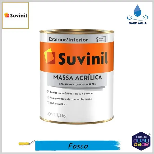 Suvinil Massa Acrílica é um produto de cor branca a base de água, de fácil aplicação e lixamento, seca rapidamente e possui grande poder de enchimento, além de boa aderência e resistência às intempéries. É indicada para nivelar e corrigir desníveis e imperfeições em superfícies internas ou externas na preparação de pinturas sobre reboco, gesso, concreto, blocos de concreto, fibrocimento e sobre paredes pintadas com látex ou tintas acrílicas, proporcionando um acabamento liso e fosco. Não aplicar sobre superfícies mofadas ou com presença de umidade.