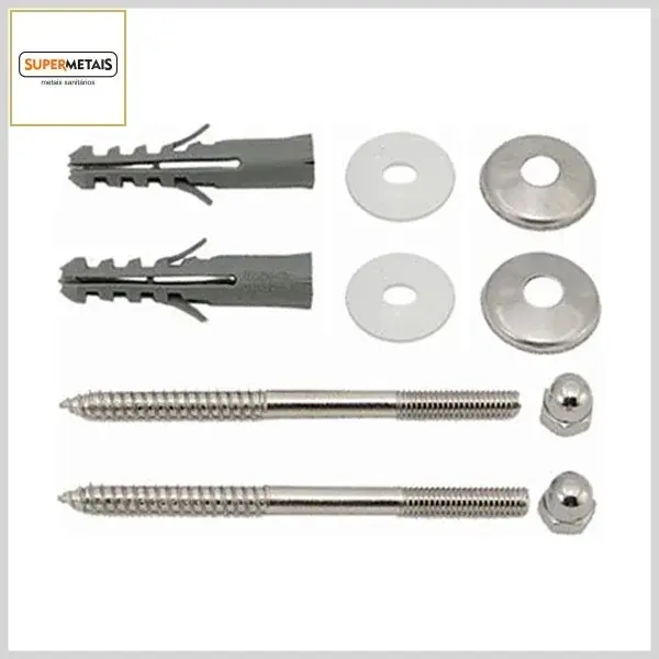 Produto composto de parafuso em aço inox, cabeça cromada e bucha plástica, sendo indicado para a fixação de bacias sanitárias, bidês, mictórios, tanques e lavatórios em banheiros, lavanderias e similares.