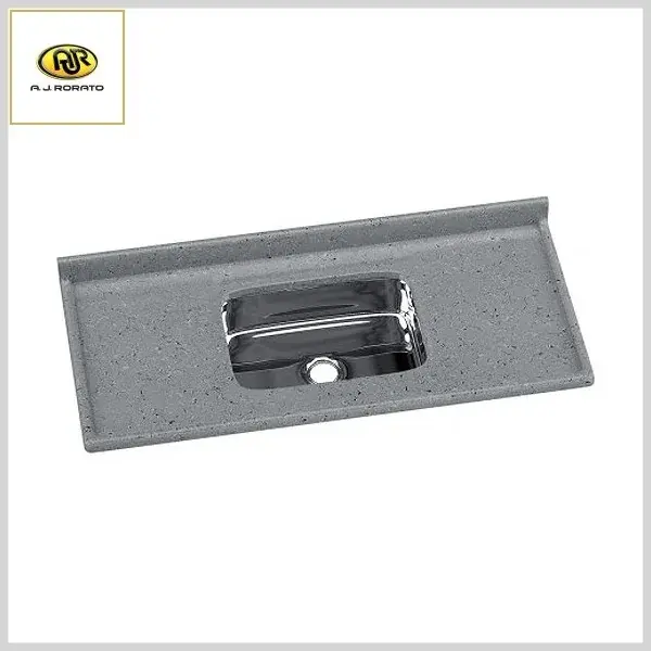 Produto em mármore sintético com espessuras reforçadas, com cobertura granitada de gel coat e com brilho e resistência incomparáveis. Superfícies mais lisas e sem porosidade, proporcionam maior higiene e fácil limpeza. O protetor de parede e suas bordas altas evitam o derramamento acidental no manuseio da água. Cuba de aço inox com 14cm de profundidade entregue já fixada ao produto,
