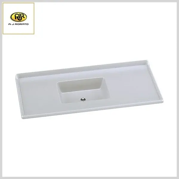 Produto em mármore sintético com espessuras reforçadas, com cobertura granitada de gel coat e com brilho e resistência incomparáveis. Superfícies mais lisas e sem porosidade, proporcionam maior higiene e fácil limpeza. O protetor de parede e suas bordas altas evitam o derramamento acidental no manuseio da água.