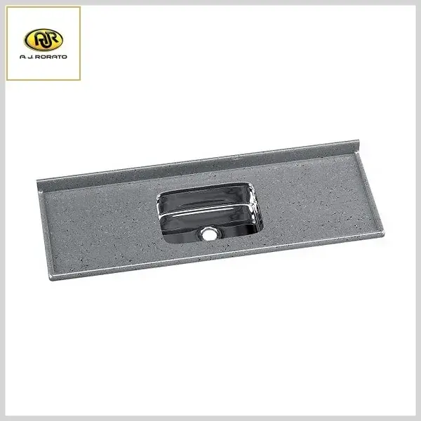 Produto em mármore sintético com espessuras reforçadas, com cobertura granitada de gel coat e com brilho e resistência incomparáveis. Superfícies mais lisas e sem porosidade, proporcionam maior higiene e fácil limpeza. O protetor de parede e suas bordas altas evitam o derramamento acidental no manuseio da água. Cuba de aço inox com 14cm de profundidade entregue já fixada ao produto,