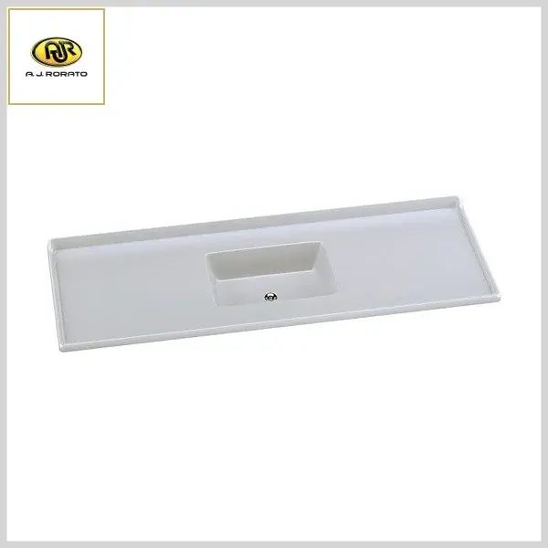 Produto em mármore sintético com espessuras reforçadas, com cobertura granitada de gel coat e com brilho e resistência incomparáveis. Superfícies mais lisas e sem porosidade, proporcionam maior higiene e fácil limpeza. O protetor de parede e suas bordas altas evitam o derramamento acidental no manuseio da água.