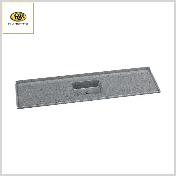 Produto em mármore sintético com espessuras reforçadas, com cobertura granitada de gel coat e com brilho e resistência incomparáveis. Superfícies mais lisas e sem porosidade, proporcionam maior higiene e fácil limpeza. O protetor de parede e suas bordas altas evitam o derramamento acidental no manuseio da água.