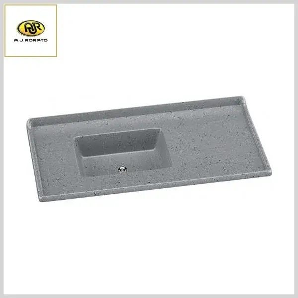 Produto em mármore sintético com espessuras reforçadas, com cobertura granitada de gel coat e com brilho e resistência incomparáveis. Superfícies mais lisas e sem porosidade, proporcionam maior higiene e fácil limpeza. O protetor de parede e suas bordas altas evitam o derramamento acidental no manuseio da água.