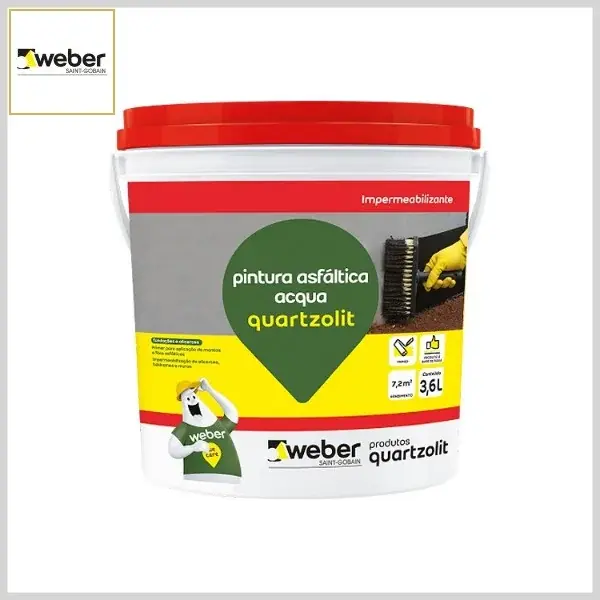 Pintura asfáltica acqua Quartzolit é uma emulsão à base de asfalto diluído em água para impermeabilizações diversas sob a forma de pintura. É indicada para pintura e proteção de superfícies metálicas, cerâmicas, madeira, concreto e alvenaria, vigas baldrame e tanques e reservatórios, podendo também ser utilizada como primer na aplicação de mantas asfálticas em lajes ou coberturas.