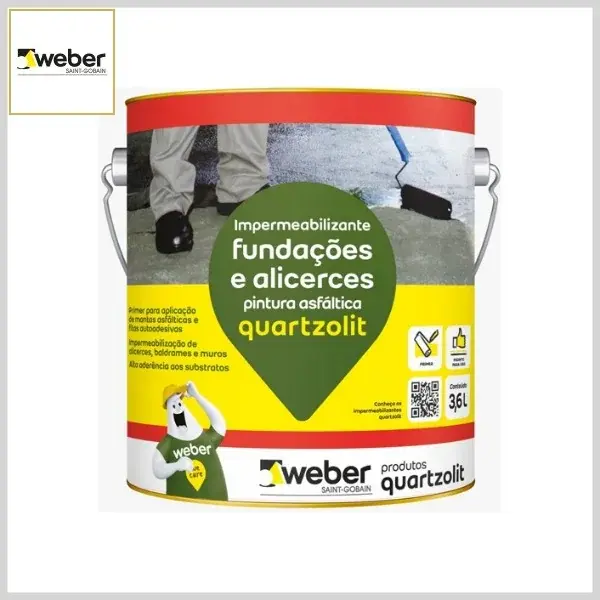 Pintura asfáltica Quartzolit é uma tinta composta por cimento asfáltico policondensado com alto teor de sólidos, diluído em solventes orgânicos. É indicada para pintura e proteção de superfícies metálicas, de fibrocimento, cerâmicas, fibra de vidro, madeira, concreto e alvenaria, vigas baldrame e tanques e reservatórios elevados ou enterrados.