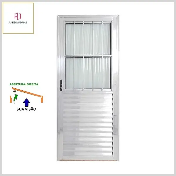 Produto manufaturado a partir de chapas e perfis metálicos de alumínio branco ou natural brilhante, na espessura de 2.5mm (linha premium), sendo indicado para fechamento de acessos para áreas exteriores, tais como cozinhas e salas de estar. Produto entregue com dobradiças instaladas, fechadura, par de chaves e postigo com grade e vidro móvel (boreal ou canelado).