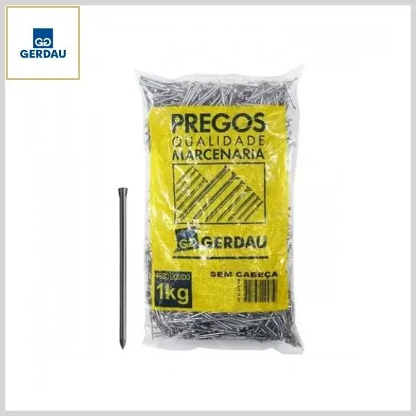 Os pregos de aço qualidade marcenaria da GERDAU possuem corpo liso e ponta tipo diamante, propiciando um melhor rendimento por quilo do produto. Não mancha a madeira e nem suja as mãos, possuindo pontas perfeitas e comprimentos precisos.