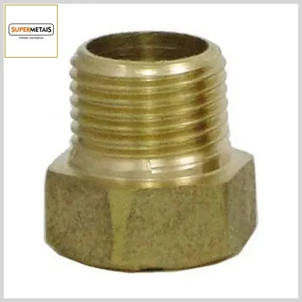 Produto com corpo em metal amarelo, sendo indicado para prolongamento de pontos de distribuição de água para torneiras ou canos de chuveiro instalados em paredes. Possui bitolas de 1/2 e 3/4 de polegada (entrada e saída).