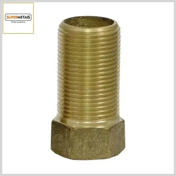 Produto com corpo em metal amarelo, sendo indicado para prolongamento de pontos de distribuição de água para torneiras ou canos de chuveiro instalados em paredes. Possui bitolas de 1/2 e 3/4 de polegada (entrada e saída).