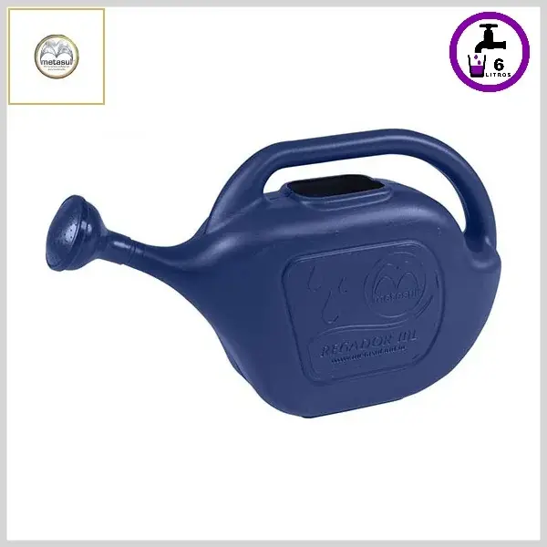 Produto confeccionado em plástico polietileno de alta densidade (recipiente e crivo), sendo indicado para regar plantas em floreiras, vasos e jardins. Fabricado com capacidades de 5, 6, 10 e 12 litros, nas cores azul, preto, verde e vermelho..