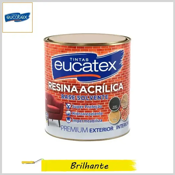 Eucatex Resina Acrílica é indicado para superfícies externas e internas de pedras naturais (Ardósia, Miracema, Pedra Mineira, São Tomé, Pedra Goiana, entre outras), concreto aparente, fibrocimento, telhas de barro, tijolos aparentes. Sua fórmula à base de resina acrílica impermeabiliza a superfície, protegendo-a da ação das intempéries, devido a sua excelente resistência e ao acabamento brilhante. É um produto de fácil aplicação, com excelente rendimento e manutenção de brilho, além de proporcionar belíssimo acabamento.