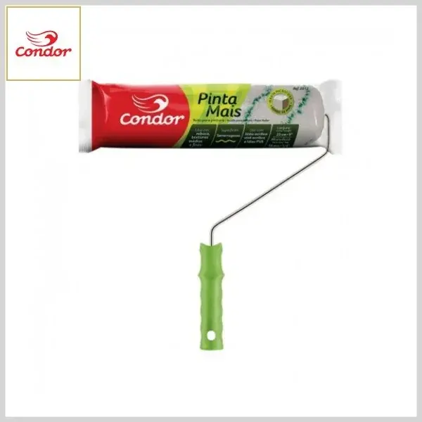 ROLO CONDOR 2012/23 com suporte (garfo) é fabricado em lã microfibra com altura de 18mm na côr branca, com listras verdes. Pinta três 3x mais se comparado com outros rolos, além de não respingar. Com 23cm de largura, é ideal para pinturas de superfícies semi-rugosas.