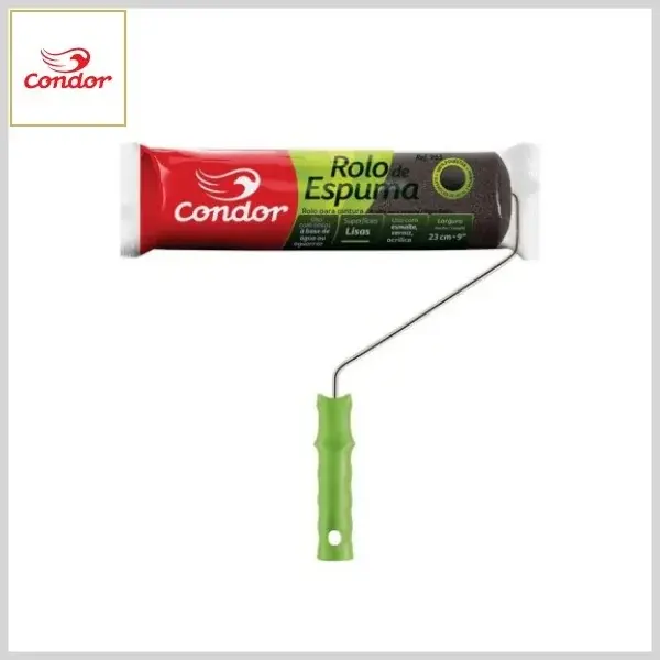 ROLO CONDOR 965/23 com suporte (garfo) é fabricado em espuma 100% de poliéster na côr cinza. Com 23cm de largura, é ideal para pinturas de superfícies metálicas e madeiras lisas com tintas látex, acrílicas, à óleo, esmaltes e vernizes.