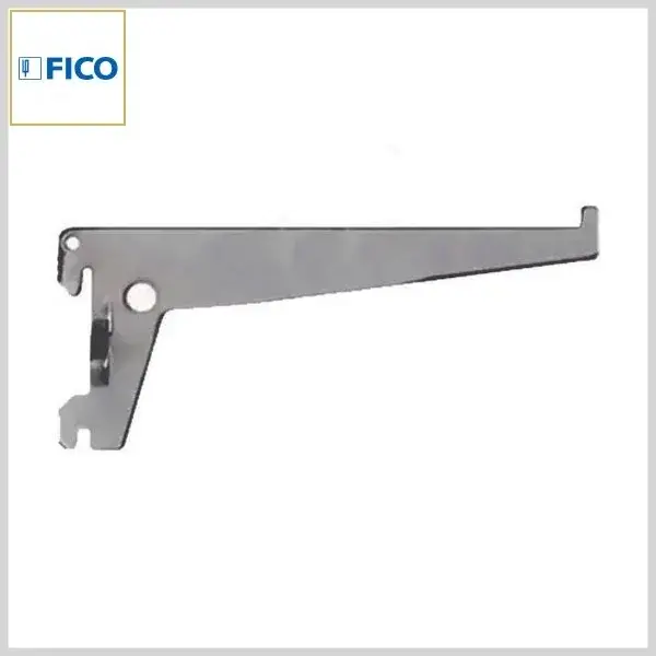 Produto feito em aço, com as opções de acabamento natural (sem banho), cromado ou zincado e também com pintura eletrostática nas cores branco, bege ou preto. Possui limitador de altura para que a prateleira não fique solta, não necessitando ser parafusado na prateleira, sendo indicado para uso exclusivo com os trilhos versátil, meia cana, duplo encaixe ou de apoio. Disponível nas medidas entre 15 a 35cm (para cargas até 50kg por suporte) e entre 40 e 50cm (para cargas até 65kg por suporte). A fixação do suporte é feita por encaixe no trilho, sem a necessidade de uso de buchas ou parafusos.